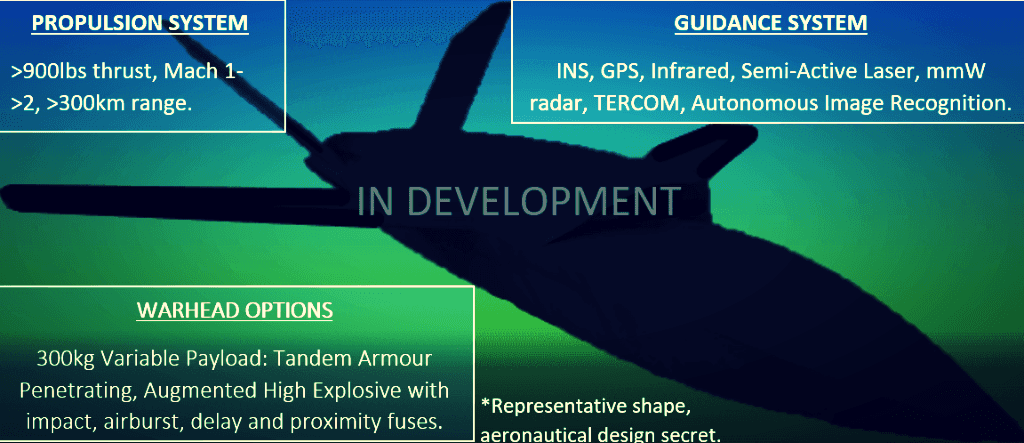 Expanding from unmanned technologies, Mechatronic Innovations aims to develop the UK's first modern supersonic cruise missile. Using experimental jet engine technology providing >900lbs of thrust to propel a 300kg multi-mission variable payload for over 300km at speeds exceeding supersonic. It will be capable of air and rail launch as well as RATO. Despite the project being at an early stage of development, projected production costs are a fraction of existing cruise missile alternatives and could provide a counter to ongoing development within other less than friendly nations. There is a significant market opportunity and defence capability gap between ~100kg and >1000kg missiles carrying <30kg to 450kg warheads especially with added stealth and supersonic capabilities. This project aims to culminate in the development and integration of a stealthy supersonic medium-long range cruise missile providing precise low-collateral deep-strike capability against a flexible range of targets under all environmental conditions at a vastly more economically justifiable cost than other solutions.